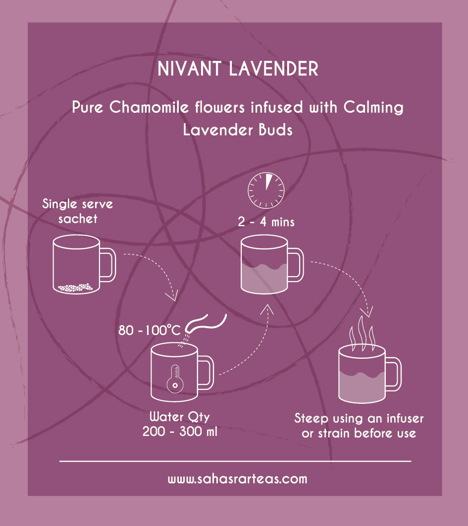 Pure unadulterated chamomile buds blended with lavender flowers provide a perfect backdrop to have a soothing and calming end of the day ritual.