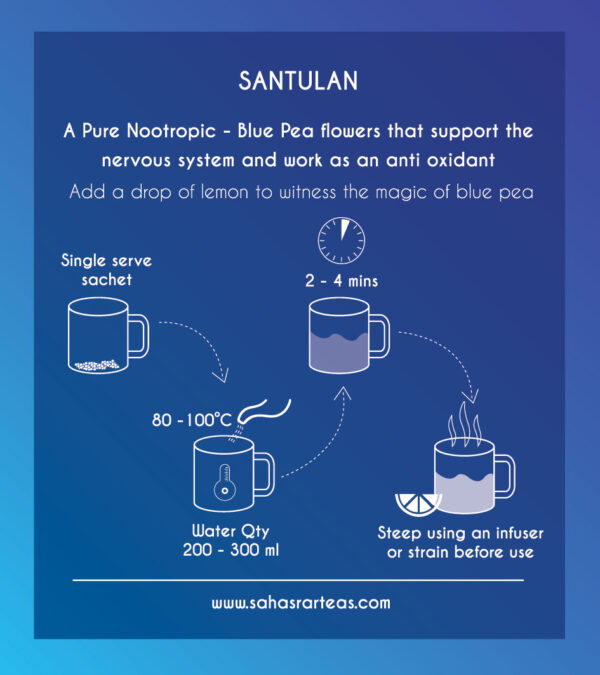 A pure nootropic, Santulan is blue pea tisane and aimed at enhancing the systemic functions of the nervous system – It is an effective diuretic and a Ph Balancing infusion